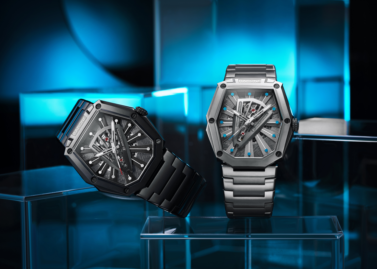 可以考慮這款個性異形款。原創八邊形自然金屬切割表殼,高溫化學油壓鍛造隕面紋理表盤,破壞性紋理工藝細節,每一道都是獨特的印記。表盤是多層次構造,最底層采用太空星際的隕石紋理,最上層是一飛船造型,有點點星際迷航的感覺;夜光表針和表盤上的夜光呼應,即使夜間也能清晰讀時,照亮你的炫酷。有IP黑色和鈦色,使整個表款硬朗而充滿神秘感。