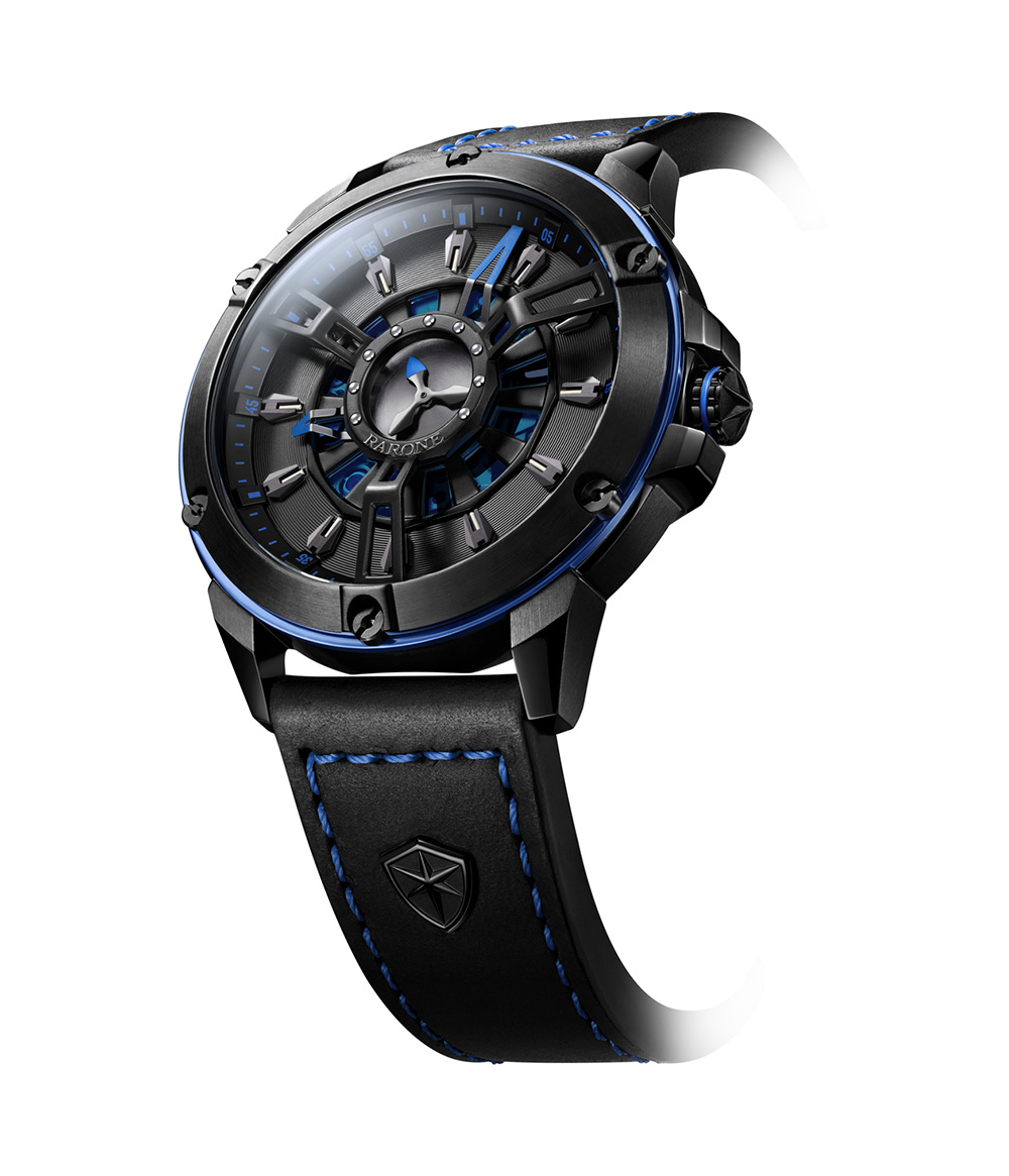 多層疊加的表盤設計搭配繁復制作工藝,造型張弛有力,字面將古羅馬戰車車輪、鉚釘、盾牌等獨特元素巧妙運用,表款整體設計錯落有致,透過表盤的折疊式秒針以及中間鏤空的戰車車輪造型,可見機械機心的律動之美!