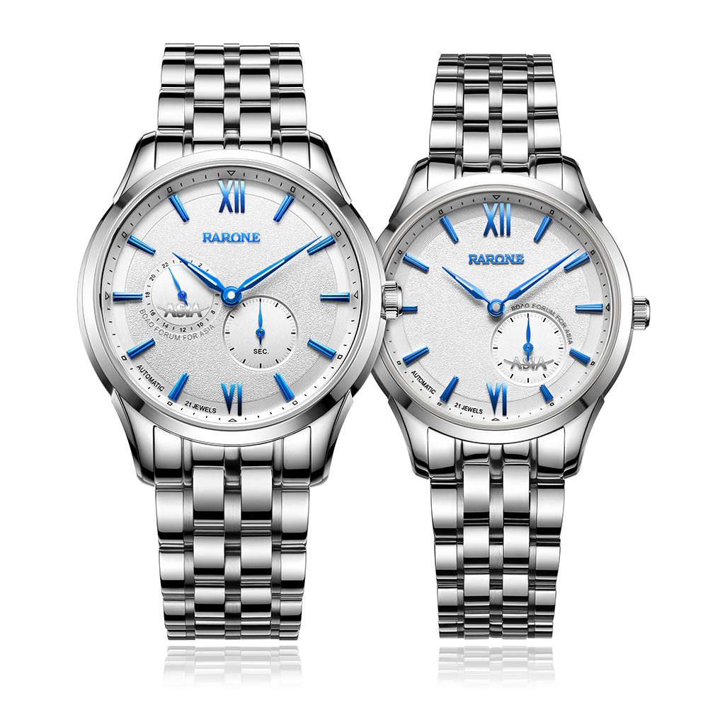 2016年新品以男女對表形式呈現(xiàn),搭載進(jìn)口全自動(dòng)機(jī)械機(jī)芯,透視底蓋清晰可見機(jī)芯運(yùn)作。男女表在設(shè)計(jì)細(xì)節(jié)上做了區(qū)別,更加匹配男女士對美的不同追求。除了經(jīng)典的黑色,間金色之外,新款首次采用鋼藍(lán)色表針和字釘,為商務(wù)用表融入活力元素,同時(shí)視覺上更加清爽。大兩針搭配60秒功能小眼顯示時(shí)間,為當(dāng)下手表的熱門設(shè)計(jì),男表9時(shí)位增加一個(gè)24小時(shí)功能小盤,方便知曉和調(diào)教多維度時(shí)間。表盤上的“ASIA”標(biāo)識(shí)體現(xiàn)腕表的身份和紀(jì)念價(jià)值。