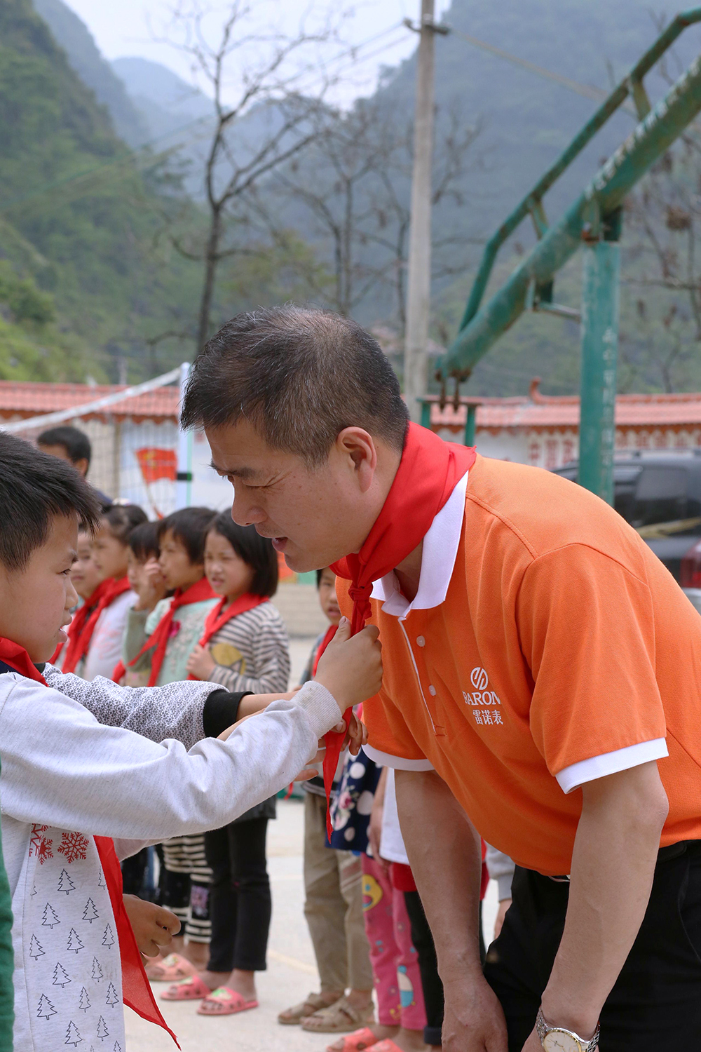雷諾表愛心小組在總經(jīng)理詹江洲先生的帶領(lǐng)下,從南寧市區(qū)出發(fā),一路上綠水青山風(fēng)景秀美,但在快要到達(dá)同社村的山路上,我們真正見識了九曲十八彎的大山路。經(jīng)過3個多小時的長途跋涉,我們的愛心車輛終于抵達(dá)同社村小學(xué),遠(yuǎn)遠(yuǎn)就看到學(xué)校的孩子在校門口等待我們,當(dāng)孩子們親手為我們系上鮮艷的紅領(lǐng)巾,雷諾表愛心小組的每個成員的使命感愈加強烈。